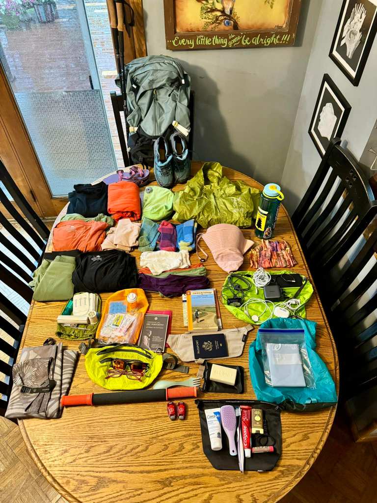I’ve pared my gear down to what I consider the essentials. The total weight (not including what I will wear and my hiking poles) is 15.17 pounds. This includes clothing, electronics, toiletries, first aid, sleeping bag liner and inflatable pillow, water bottle, muscle roller, hat, rain poncho, lightweight towel, passport, sunglasses, reading glasses, and guidebooks/maps.
