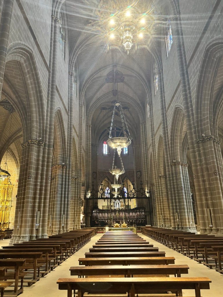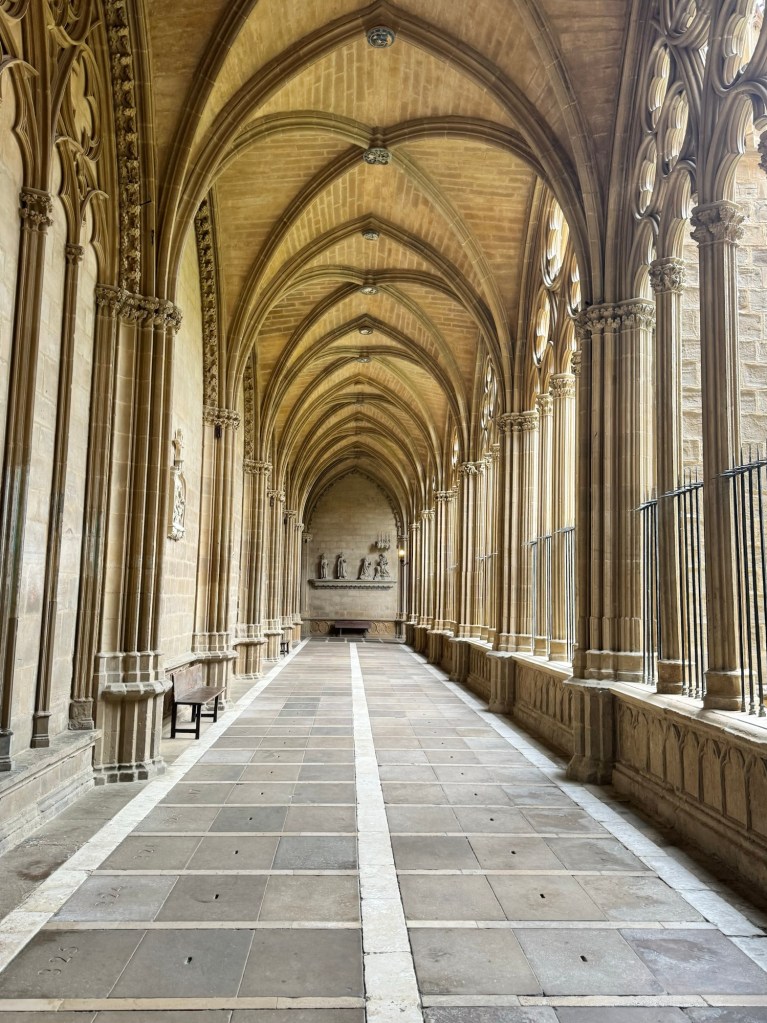 It rained all day. All. Day. And I mean torrential downpours that could render surfaces muddy and slippery. I postponed starting my walk today while I waited for a break in the weather. I wandered around Pamplona for a while, getting a few things I needed (more sunscreen, more ibuprofen, a different phone charger than the one I had that needed a European adapter in order to use). Had a bite for lunch, and then wandered over to St. Mary’s Cathedral which was open to the public to explore, and the adjacent museum.